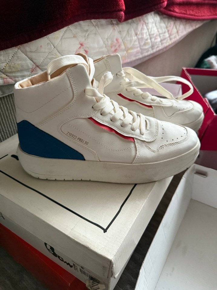 Dolgu topuklu ve kauçuk tabanlı beyaz kadın spor ayakkabısı, cırt cırtlı ve baskılı detaylara sahip. Günlük sokak stili için uygun.