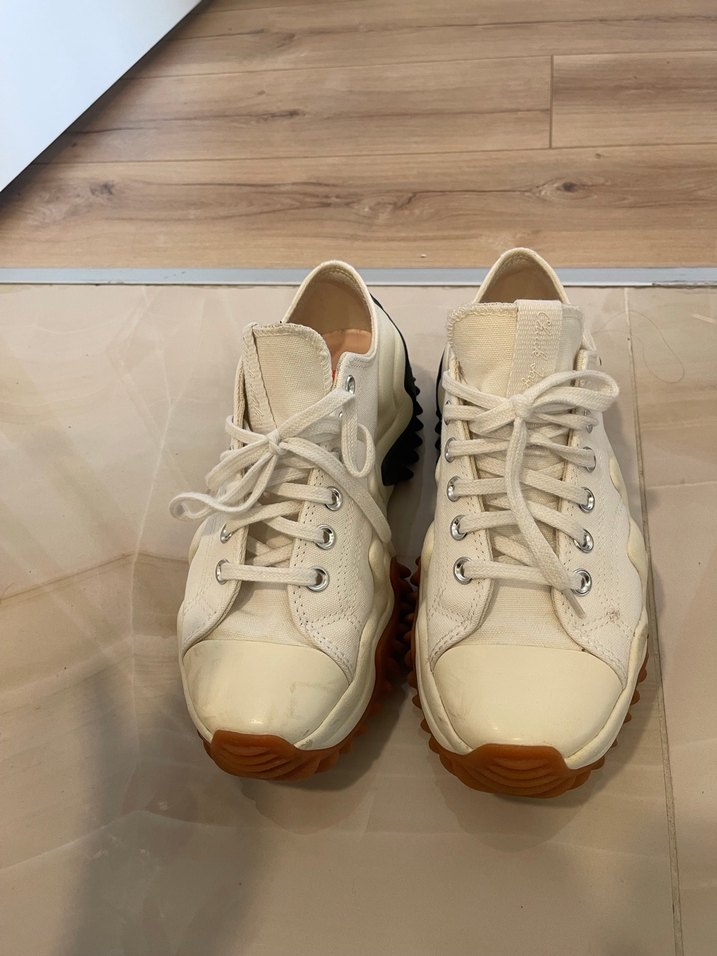 Beyaz renkli, bağcıklı ve dolgu topuklu kadın spor ayakkabısı. Kauçuk tabanlı, günlük sokak stiline uygun şık ve rahat tasarım. 2 kere giyildi