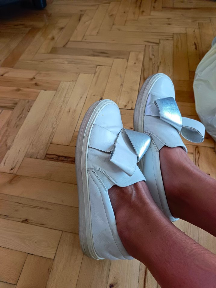 Beyaz renkli, ve tokalı detaylara sahip kadın spor ayakkabısı. Kauçuk malzemeden üretilmiş, sokak stili ve günlük kullanım için uygundur. ufak leke var resimde belirttim