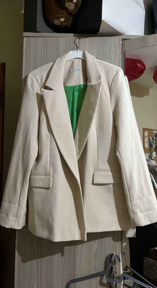 Beyaz renkli, düğmeli, normal kesim, uzun kollu kadın blazer ceket.