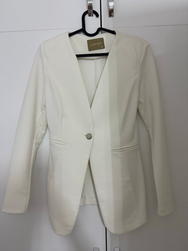 Beyaz renkli, düğmeli, klasik kesim kadın blazer ceket. Pamuk kumaştan, uzun kollu ve midi boyda, ofis için uygun modern klasik tarzda.