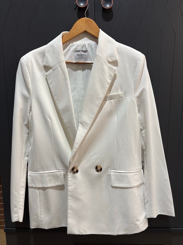 Beyaz renkli, düğmeli, notched lapel yakalı kadın blazer ceket. Regular fit, midi boy, sentetik kumaştan, ofis ve günlük kullanıma uygun. Ürün çok temiz kullanılmıştır her hangi bir defosu yoktur.