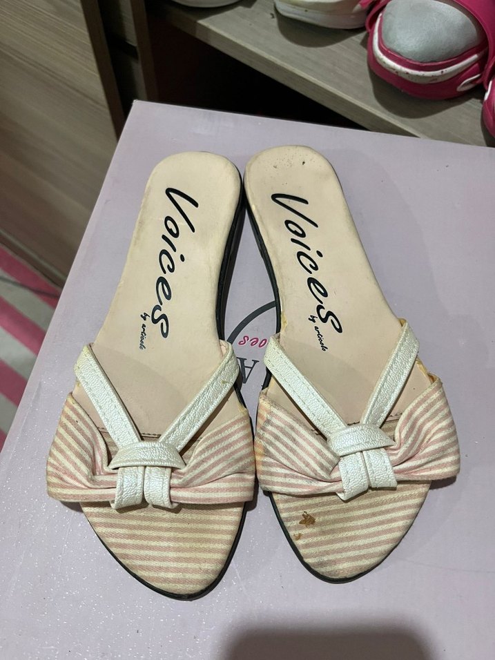 Kadın terlikler, pileli fiyonk tasarımlı ve yumuşak kauçuk tabanlıdır. Pastel beyaz renkte olup bohem stil ve düğün için uygundur. İçinde 'Voices' markası bulunur. kullanilmadi beklemekten boyle görünüyor marka temsilidir