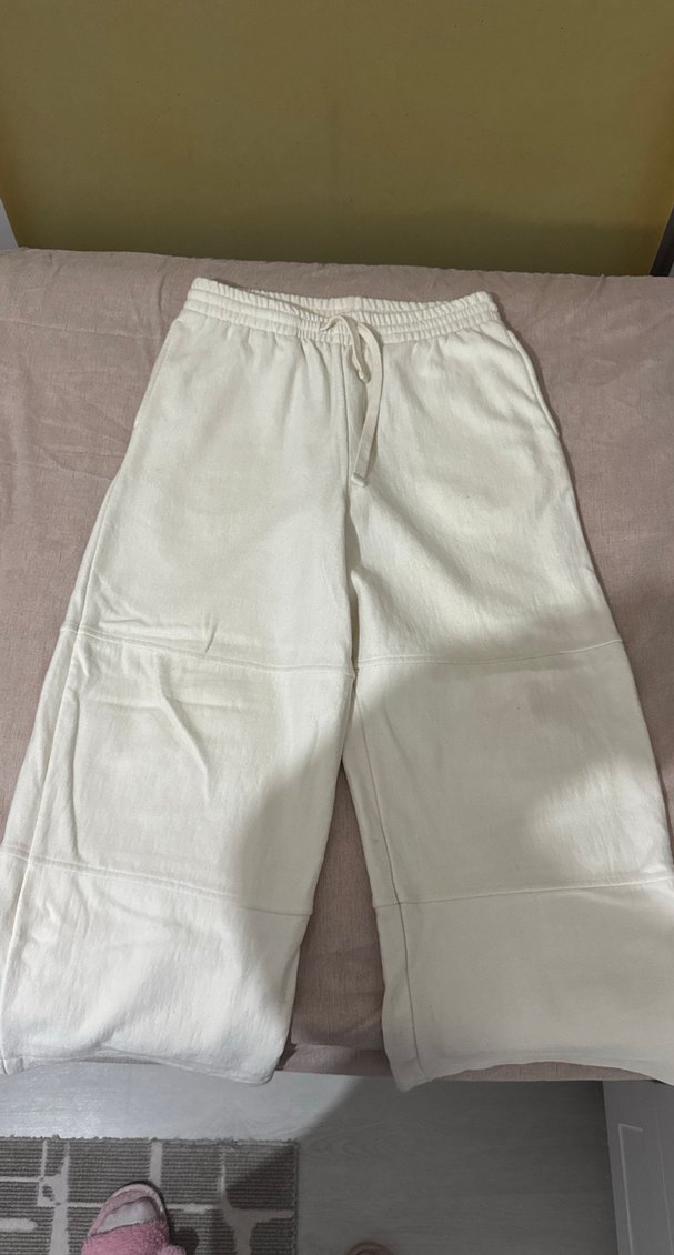 Beyaz keten kumaştan, salaş kesim ve midi boyda, günlük kullanıma uygun rahat ve şık eşofman pantolonu.