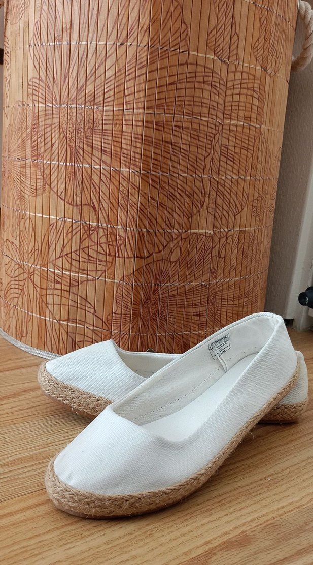 Beyaz pamuk espadril, minimalist ve desensiz tasarıma sahip, günlük kullanım için rahat ve şık.