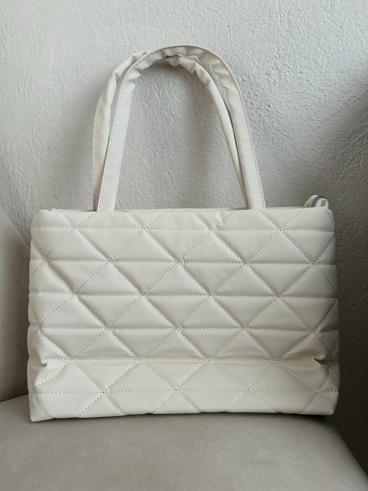 Bu beyaz çanta, fermuarlı kapama ve sade saplarıyla günlük sokak stiline uygun şık bir tasarıma sahiptir.