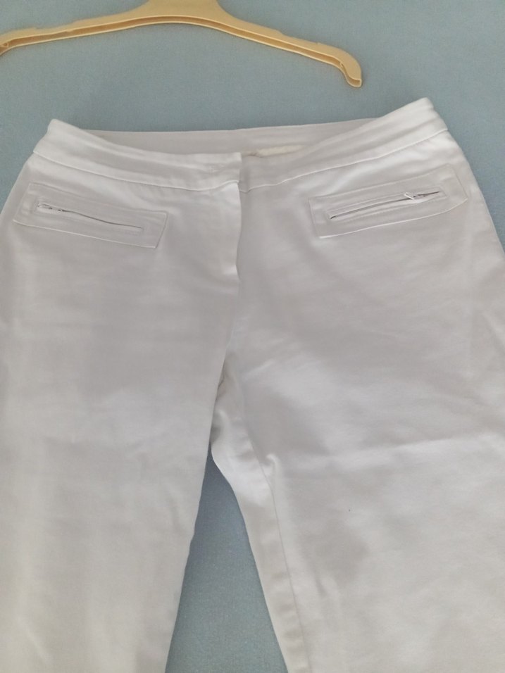 Beyaz, midi boy, regular fit kumaş pantolon. Fermuarlı cepleriyle günlük rahat kullanıma uygun, sentetik kumaştan yapılmıştır. 38 40 bedene uyumludur