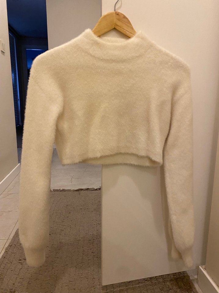 Beyaz, fitted kesim kadın kazak, uzun kollu ve bisiklet yaka. Yumuşa gündelik kullanım için rahat ve desensiz.