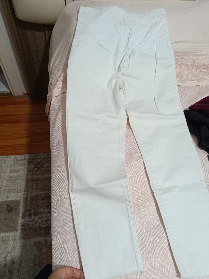 Beyaz, midi boy, regular kesim kadın kumaş pantolon. Bel detaylı, sentetik kumaştan rahat ve günlük kullanıma uygun.