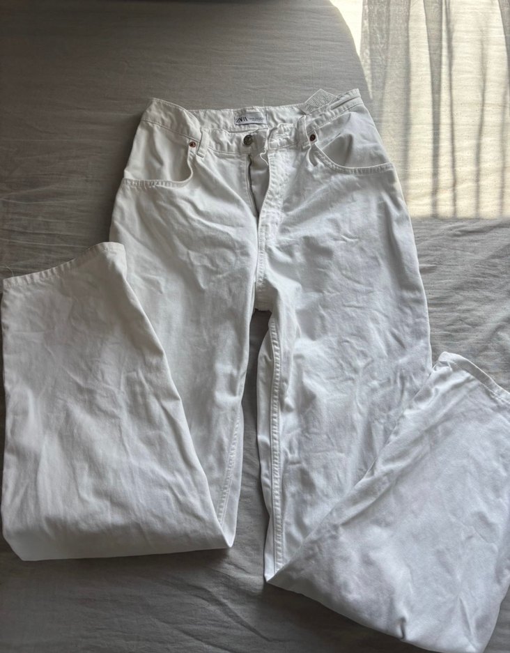 Beyaz kumaştan, geniş kesim ve midi boyda kadın pantolonu. Desensiz tasarımı ile sade ve şık, günlük kullanıma uygundur.