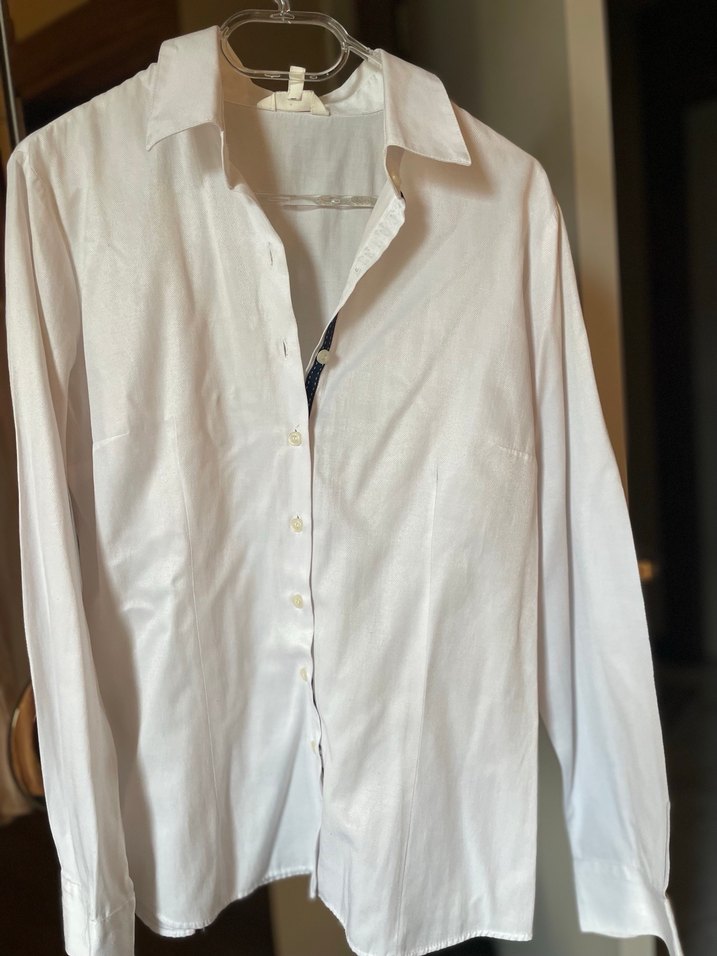 Düğmeli, yakalı ve uzun kollu beyaz kadın gömleği. İpek gibi parlak kumaştan, pamuklu. Göğüs pensli belden oturtturmalı kesim ve ofis kullanımı için uygun. Yepyeni ✨#Öğretmen #Ofis #İş
