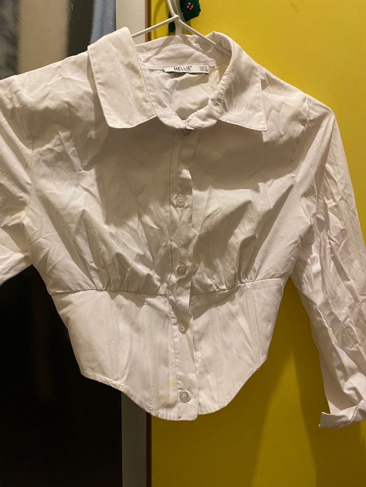 Düğmeli, yakalı beyaz gömlek. Normal boyda ve vücuda oturur kapandığım için satıyorum defosu yoktur 1 kere giydim