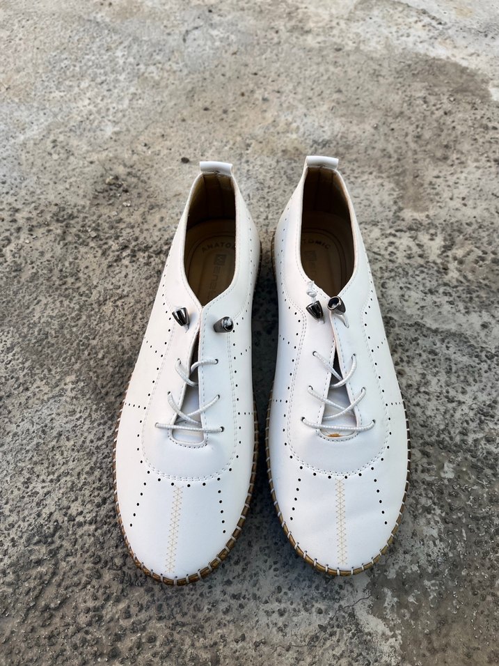 Beyaz kadın günlük ayakkabı, dolgu topuklu ve sade tasarımlıdır. Rahat ve günlük kullanım