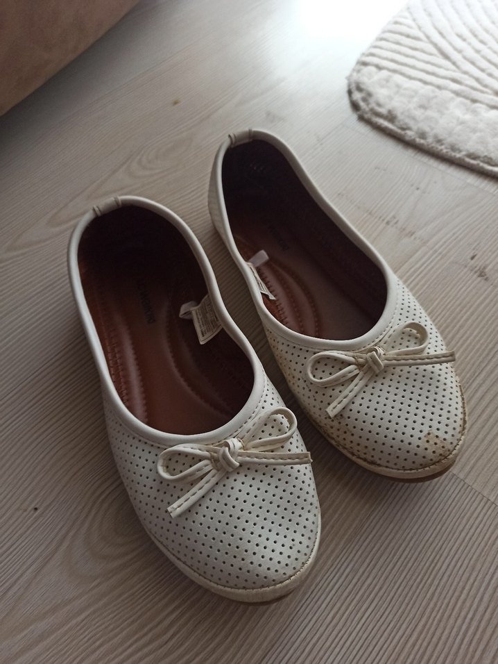 Beyaz, delikli, dolgu topuklu kadın babetler. Elastik detaylı, rahat ve şık günlük kullanım için uygun. Sadece iki kez giyebildim kalıbı darmış ayağımı sıktı 37 giyene olur