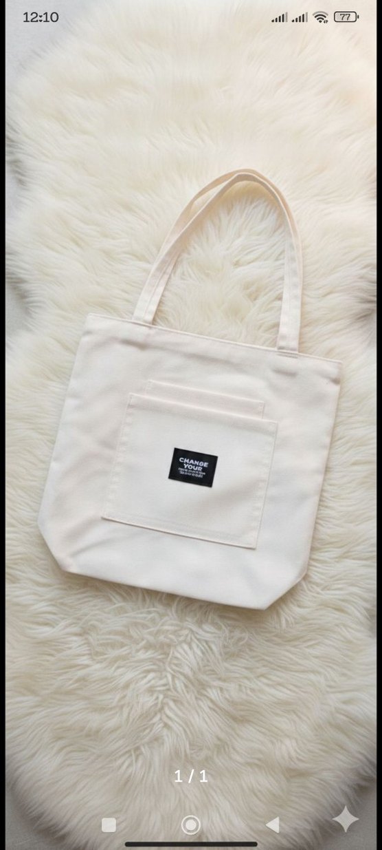 Yumuşak kumaştan, ön cepli, baskılı etiketli beyaz kadın omuz çantası. Minimalist ve sokak tarzına uygun, günlük kullanım için ideal.
