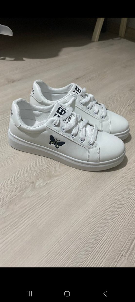 Beyaz kadın spor ayakkabısı, blok topuklu ve renkli kelebek baskılıdır. Trendy günlük sokak stili için kauçuk tabanlı, bağcıklı ve 'LD' yazılıdır.