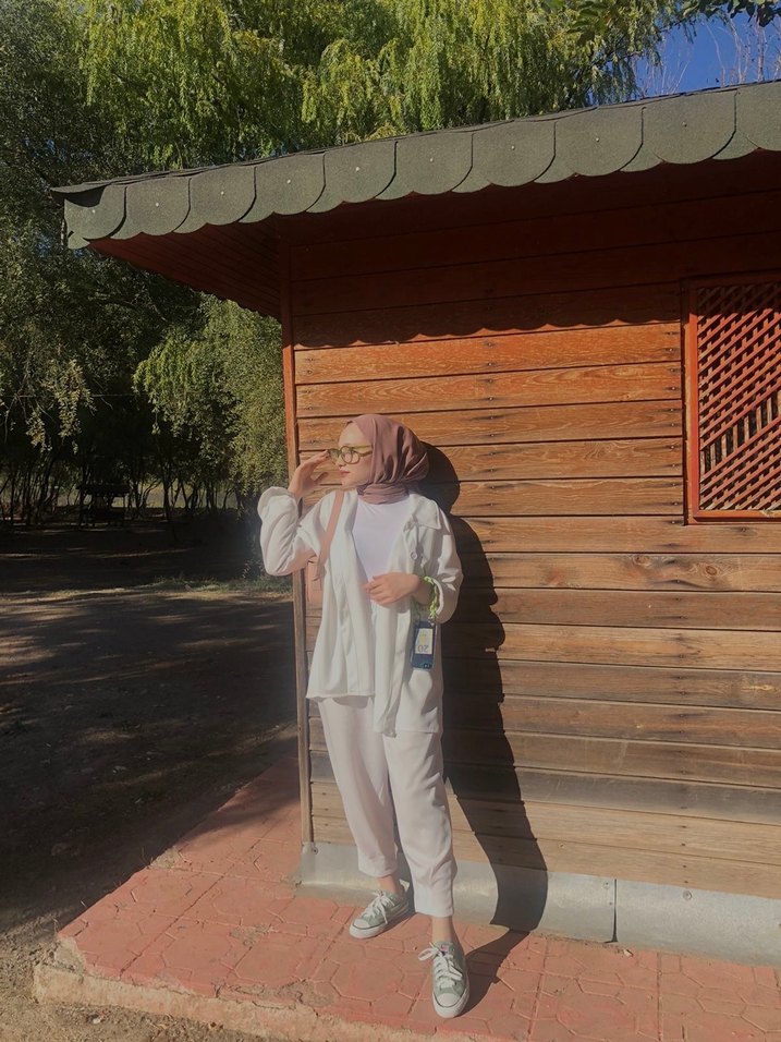 Beyaz renkli, pamuklu kumaştan üretilmiş, yüksek yakalı ve uzun kollu, salaş kesim midi uzunluğunda kadın takım elbisesi. Minimalist ve desen içermeyen tasarımıyla gündelik 1 defa giyildi