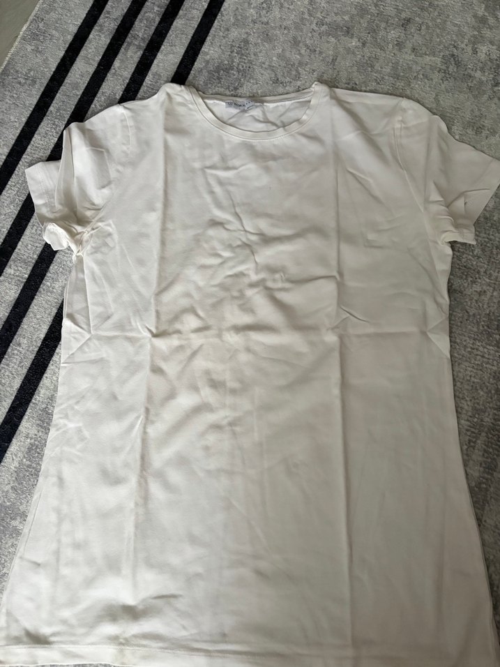 Beyaz, desen içermeyen, ince ve vücuda oturan kadın tişörtü. Normal boyda ve minimalist tarzda, yumuşak dokulu.