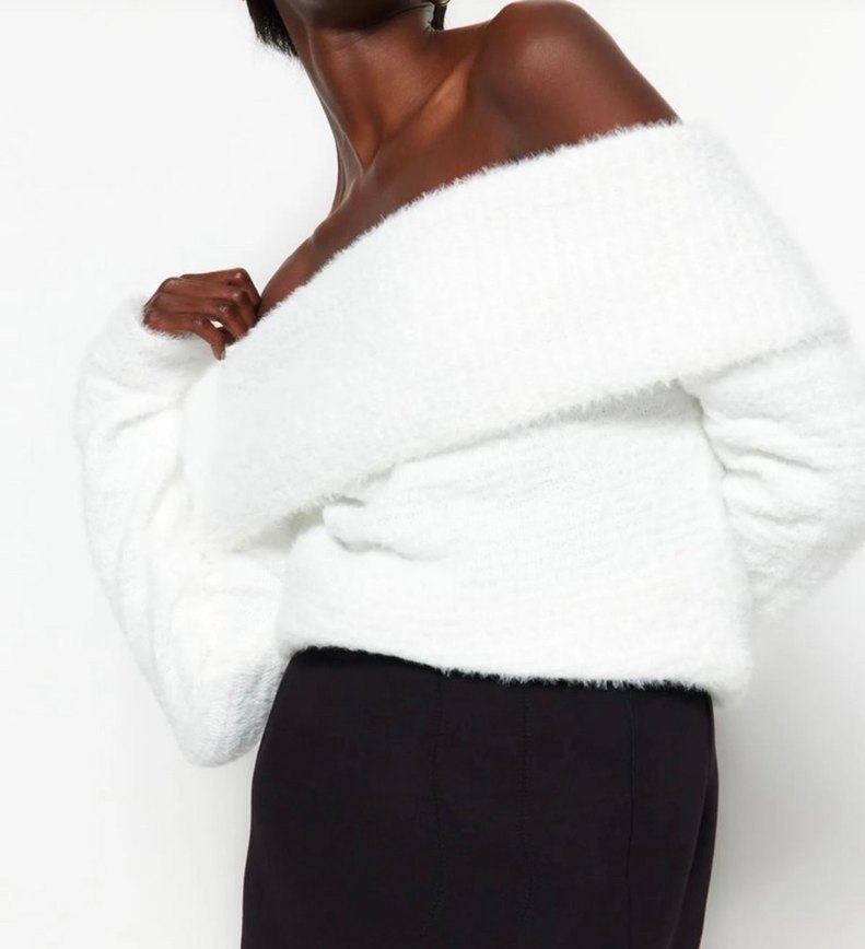 1 kere giyildi hiçbir kusuru yoktur Beyaz kadın kazak,kürk detaylı kayık yaka ve uzun kolludur. Vücuda oturan kesimi ve midi boyu ile yumuşak ve sıcak kumaştan üretilmiştir. Trend sokak stili için uygundur.