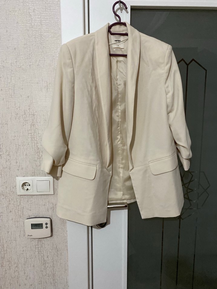 Beyaz keten kumaştan, kesimli yaka ve düğmeli, uzun kollu, normal kesim kadın blazer ceket. Ofis için uygun.