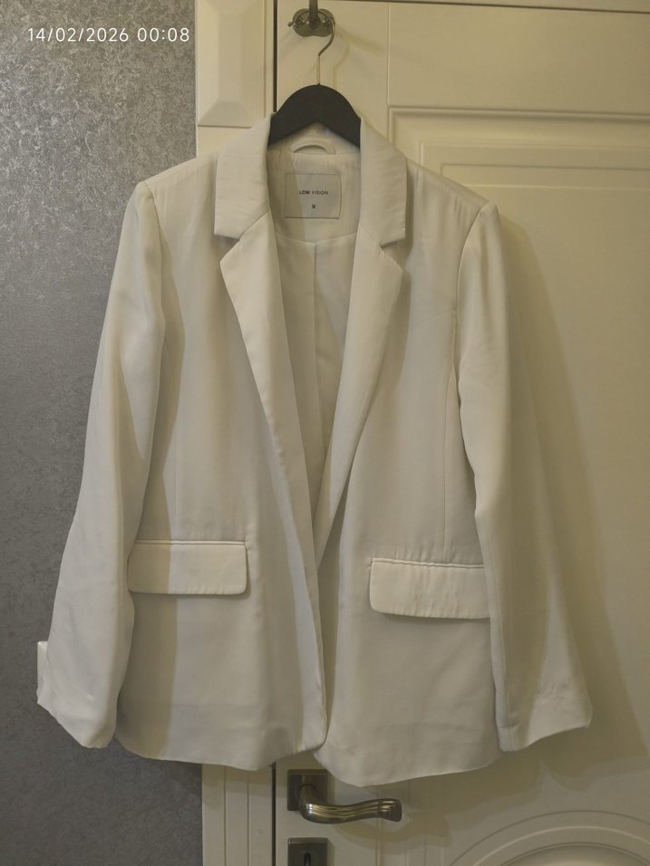 Beyaz keten blazer, keskin yaka ve uzun kollu. Normal midi boyda, düzenli kesim, ofis için uygun sade ve desensiz tasarım. Rahat şıklık sunar.
