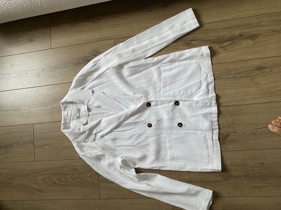 Beyaz keten kadın ceket, düğmeli ve kesimli yakalıdır. Uzun kollu, normal kesim, günlük kullanıma uygundur. Minimalist bohem tarzda midi boy, desensiz model.