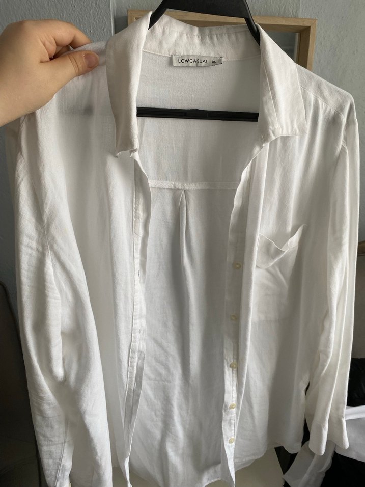 Beyaz keten kadın gömlek, yakalı ve düğmeli. Uzun kollu, normal boyda ve bol kesim, günlük kullanım için uygun.