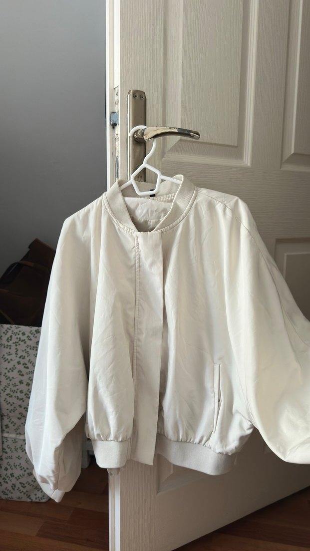 Bol kesim beyaz keten ceket, uzun kollu ve yakalıdır. Minimalist ve normcore tarzıyla günlük kullanıma uygundur.