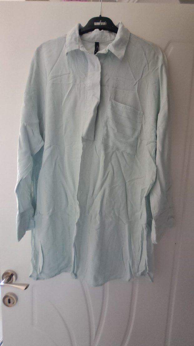 Salaş kesim beyaz keten kadın gömlek, uzun kollu ve yakalıdır. Düğmeli ve cep detaylıdır, günlük kullanıma uygundur.