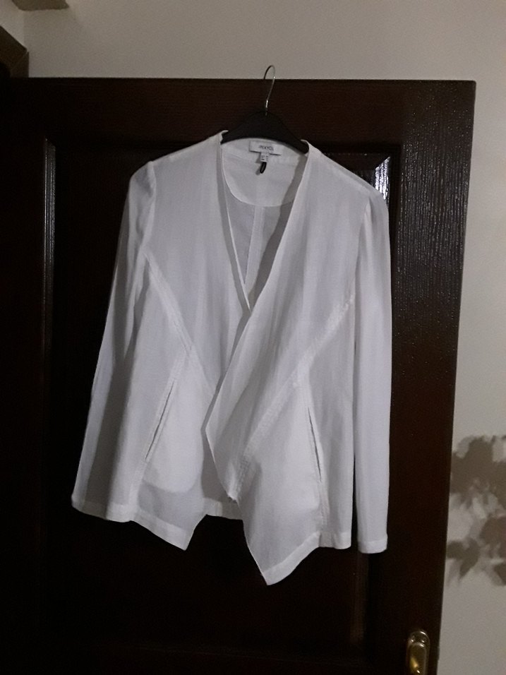Beyaz keten kumaştan, drapeli ve kesik yakalı asimetrik kesim kadın ceket. Uzun kollu, normal boyda, minimalist ve modern tasarıma sahip. ölçüleri görsellerde mevcuttur.