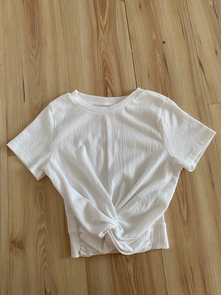 Beyaz keten kumaştan kısa kollu, yuvarlak yakalı ve pileli detaylı tişört. Rahat kesim ve normal boyda, günlük kullanıma uygun sade tasarım.