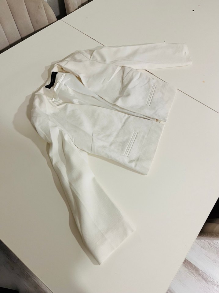 Beyaz keten kumaştan, notched lapel yakalı ve fermuarlı, normal kesim, uzun kollu midi blazer. Minimalist sokak stili için uygundur. ✨