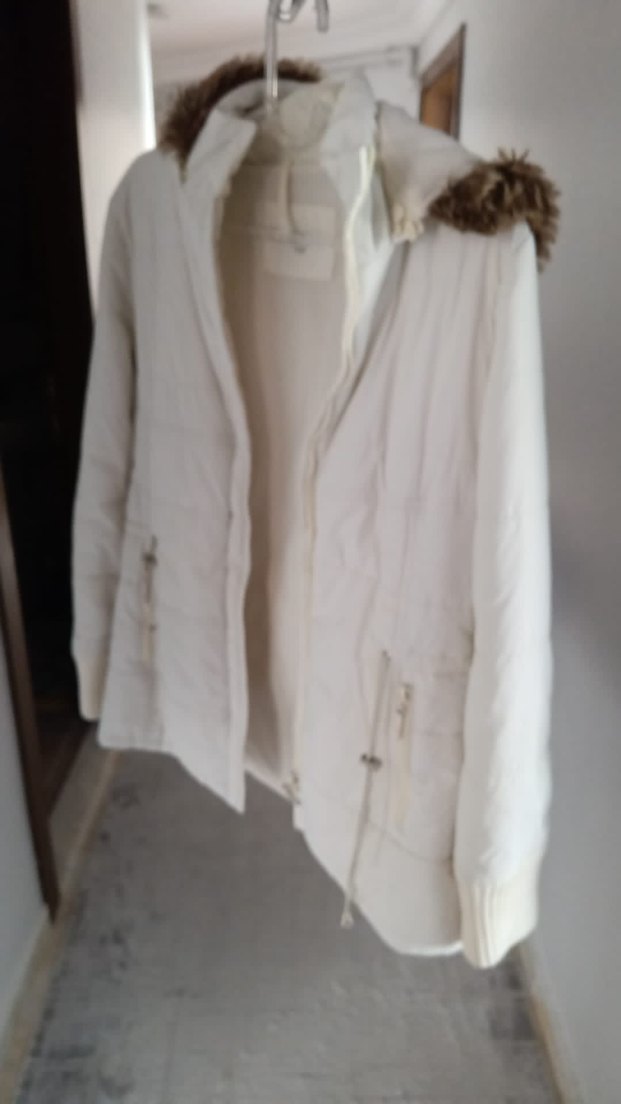 Beyaz keten kumaştan, fermuarlı cepleri ve kesimli yakasıyla şık midi uzunlukta kadın ceket. Uzun kollu, rahat sokak stili için ideal.
