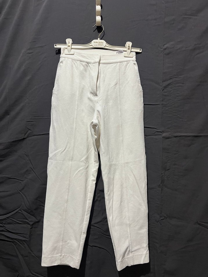 Beyaz keten kumaştan, kemerli ve midi boy, regular fit kadın pantolon. Minimalist ve ofis stiline uygun sokak modası tarzında.