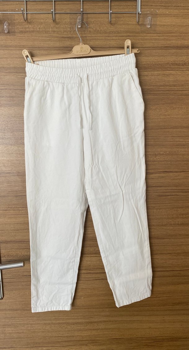 Beyaz keten kumaştan, rahat kesim ve normal midi boyda, lastik bel detaylı kadın pantolonu. Minimalist ve sade tarz, günlük kullanıma uygun.