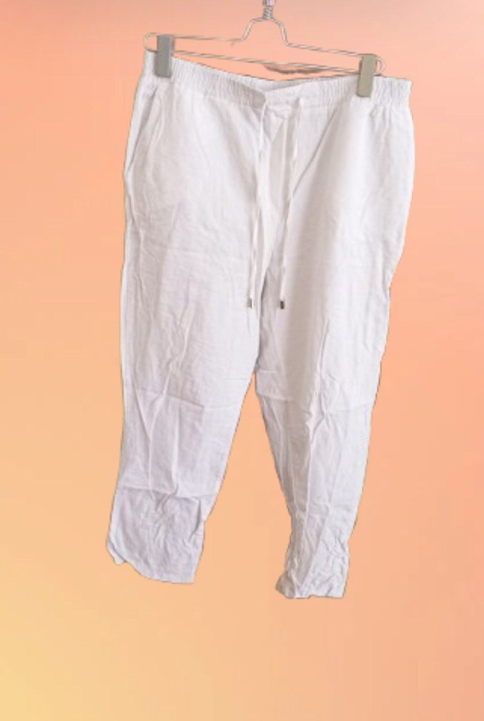 42 beden,Beyaz keten kumaştan, salaş kesim ve midi boyda, elastik bel detaylı, minimalist tasarıma sahip kadın pantolon. Günlük kullanıma uygundur.