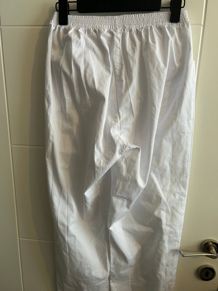 Beyaz keten kumaştan, salaş kesim ve drapeli tasarıma sahip, midi boyda rahat kadın pantolonu. Elastik bel bantlı, minimalist tarzda günlük kullanıma uygun.