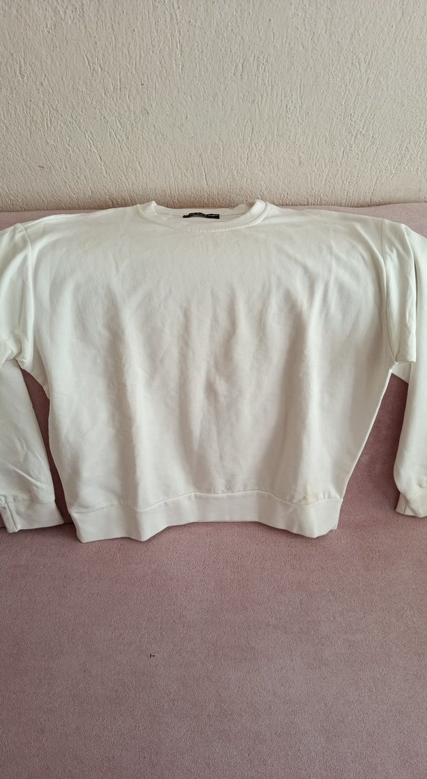 Beyaz, keten kumaştan, yuvarlak yakalı ve uzun kollu, bol kesim kadın sweatshirtü. Rahat ve sade günlük sokak tarzı için uygundur.