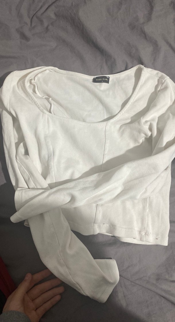 Yumuşak keten kumaştan yapılmış beyaz, vücuda oturan uzun kollu kadın tişörtü. Yuvarlak yaka ve midi uzunlukta, günlük sokak stili için uygun.