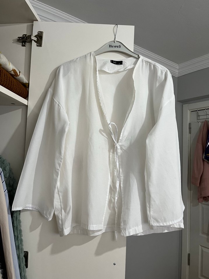 Beyaz keten kumaştan, V yaka ve uzun kollu, bol kesim kadın gömleği. Düğmeli ve minimalist tarzda, günlük kullanıma uygun.