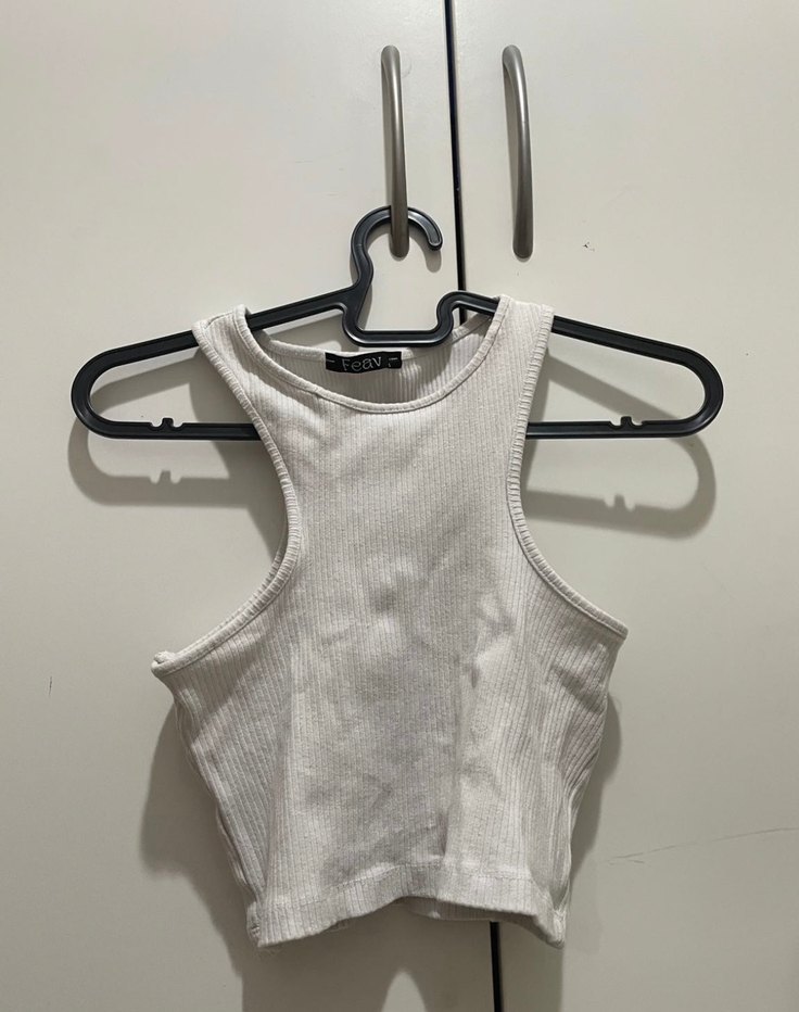 Beyaz kadın keten kumaştan, yüksek yakalı ve dar kesim atlet. Kolsuz ve midi boyuyla minimal ve sokak stiline uygun.