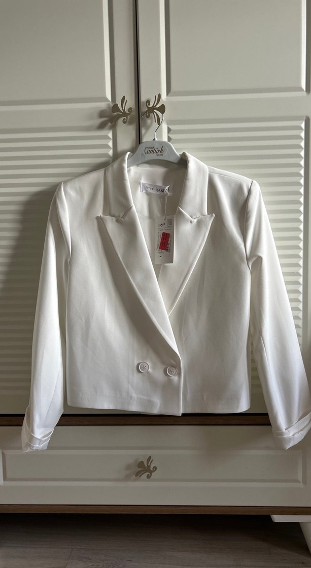 Beyaz Kadın Kısa Kesim Düğmeli Blazer