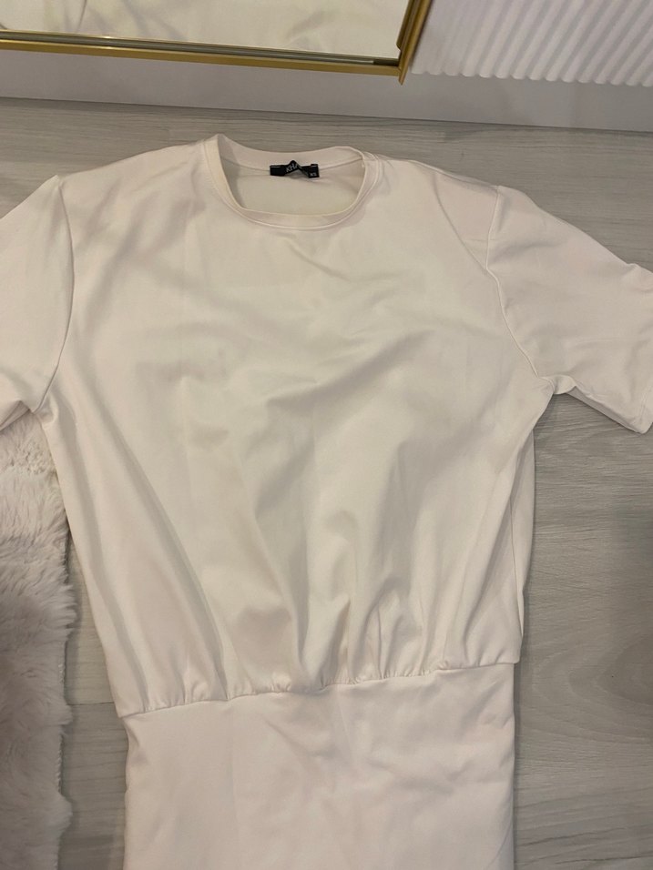 Beyaz renkli, kısa kollu ve yuvarlak yakalı kadın tişört elbise Yumuşak sentetik kumaştan, normal midi boyda, basic ve rahat bir tasarıma sahip.