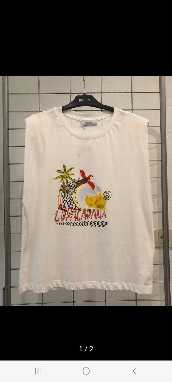 Pamuklu, beyaz, kısa kollu, salaş kesim kadın tişörtü, kısa boy ve Copacabana baskılı desen ile.