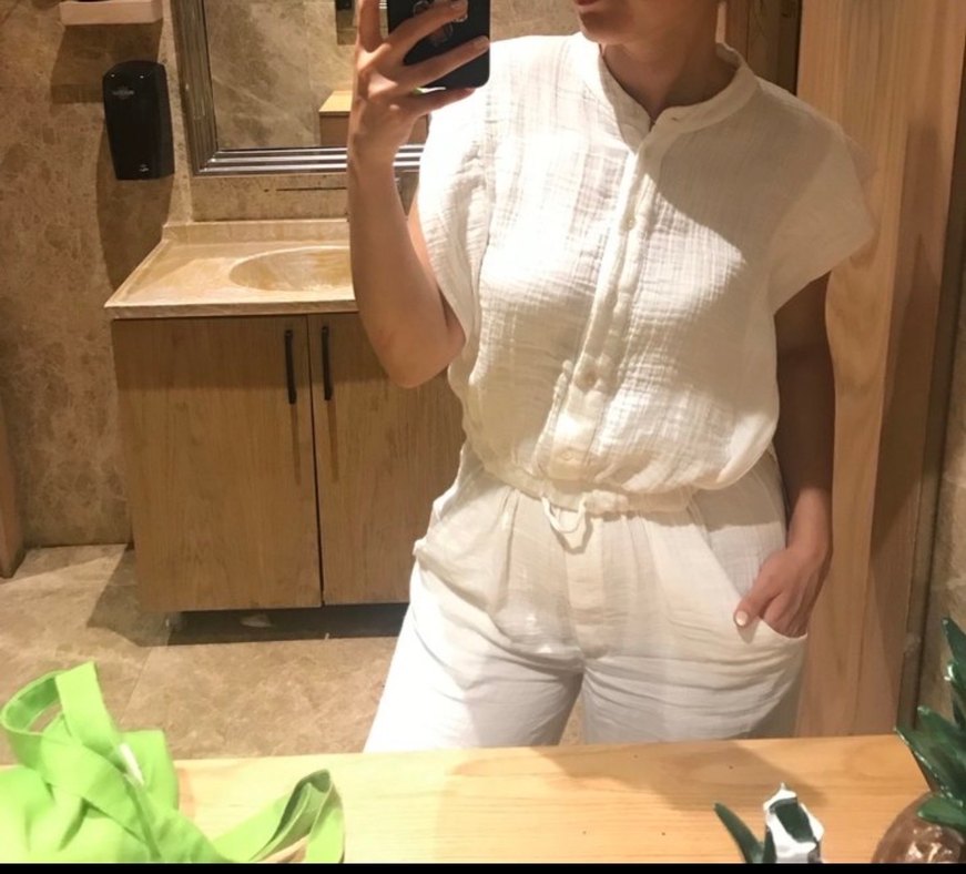 Beyaz pamuk kumaştan, kısa kollu, yüksek yakalı ve normal kesime sahip midi uzunlukta minimalist tulum. Günlük kullanım için rahat ve şık bir seçenek. Tek eksiği belimdeki ipi yok