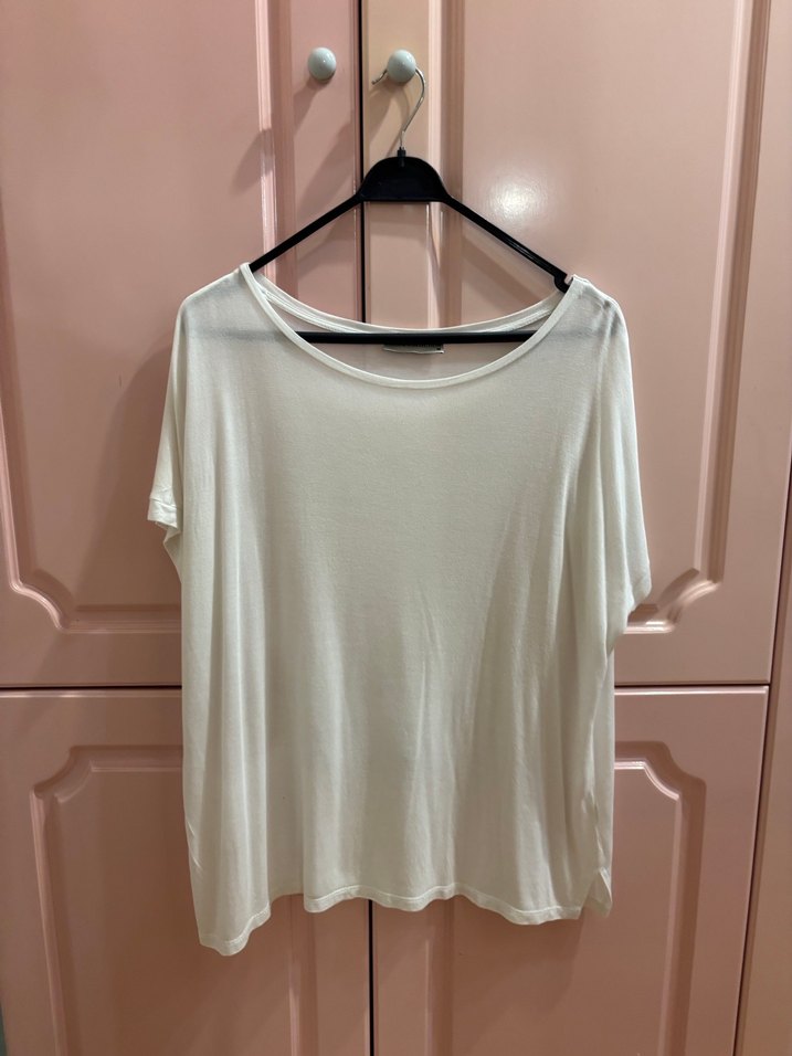 Beyaz renk, kısa kollu, yuvarlak yakalı ve salaş kesim kadın tişörtü. İpeksi dokusuyla minimal ve rahat bir şıklık sunar, günlük kullanıma uygundur. İki kol arası 69 cm Boy 65 cm