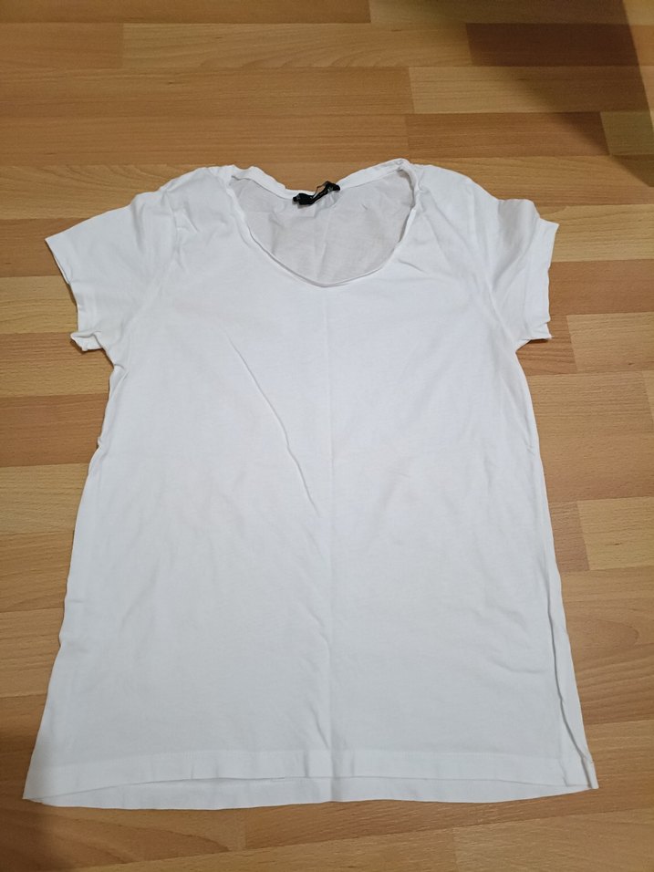 Beyaz, kısa kollu, yuvarlak yaka, pamuk kumaştan, normal boyda ve bol kesim kadın tişörtü. Minimalist tarzda, rahat kullanım için uygundur. Kusuru fotoğrafta görülmektedir.