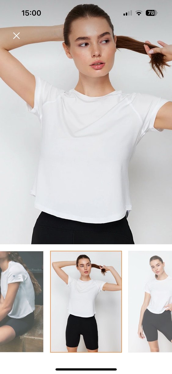 Beyaz, yuvarlak yakalı, kısa kollu ve bol kesim kadın tişörtü. Pürüzsüz sentetik kumaştan üretilmiştir. Spor ve günlük sokak stiline uygundur.
