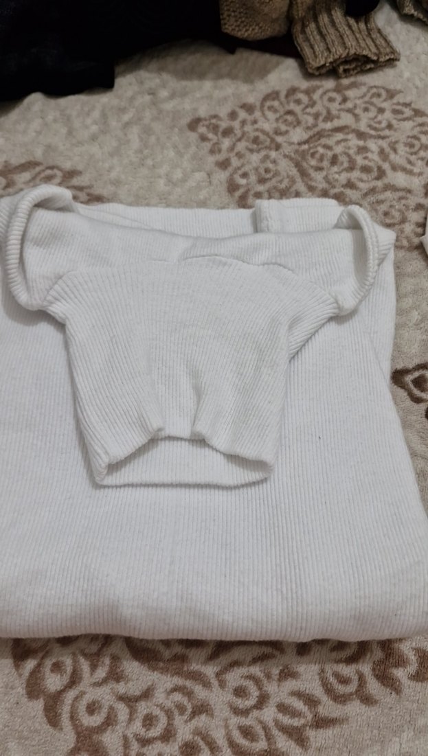 Beyaz, örgü kumaştan kısa kesim, tek renk ve dar kesim kadın triko bluz. Kayık yaka ve askılı kollarla sade, günlük kullanıma uygun.