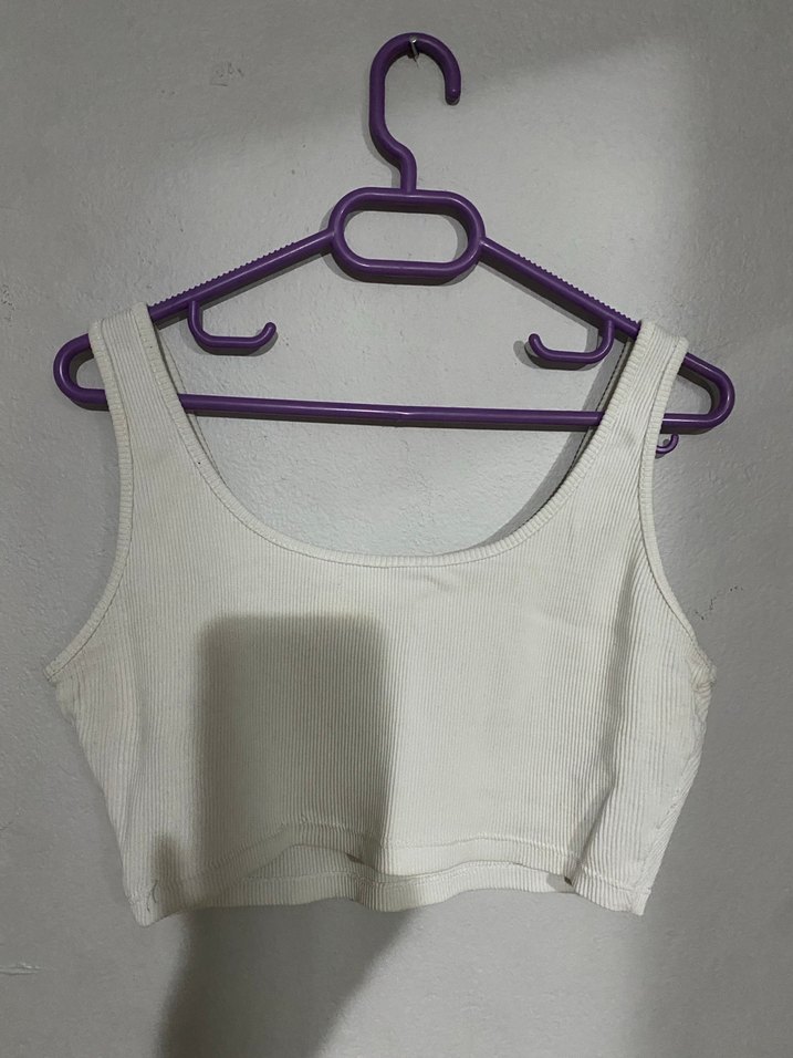 Beyaz, kısa kesim ve bisiklet yaka olan pamuklu, kolsuz kadın atlet, günlük kullanıma uygundur.